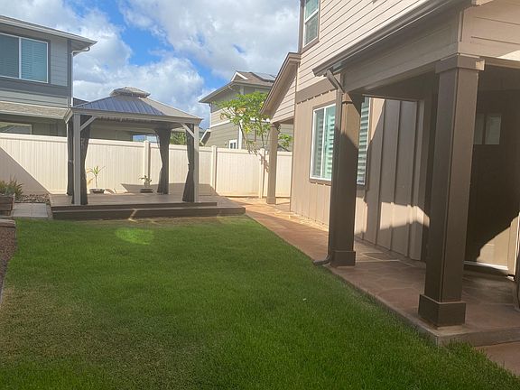 Enjoy this 3-bedroom 2.5 bath home in Seabridge. Highly desired, large fenced lot with a full fence. Upgraded Bosch stainless steel range/oven, microwave, and dishwasher with Corian countertops and a center island. This energy efficient home features Low-E dual paned vinyl windows with plantation shutters, central air conditioning, solar water heater with 80-gallon tank, 8 PV Panels, and a Nest Smart Thermostat. Each bedroom has built in organizers and the walk-in master closest is very large. Large 2 Car garage and several guest parking across from the garage. A large washer and dryer in the garage. Stamped concrete pad goes all around the home and the back yard boost a gazebo and deck with French drains around the home. Fully fenced backyard is low maintenance & perfect for entertaining or relaxing. Yard has a sprinkler system and an additional sink in the back of home to wash off sand from the beaches that are close by. Also, lots of guest parking close to this home. Convenient to many amenities: golf courses, restaurants, stores, Ka Makana Mall, and the beach! 2 Nest cameras and a nest thermostat. No pets. Water/sewer/trash included with rent. Water/sewage/trash included. Tenant pay electric, yard service, cable, phone, internet.Central air conditioning, solar water heater with 80-gallon tank, 8 PV Panels, and a Nest Smart Thermostat