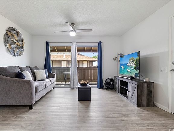 Discover this beautifully renovated 2-bedroom, 1.5-bath corner unit in the desirable Palm Villas. Featuring new luxury vinyl plank flooring, an upgraded kitchen with quartz countertops, and modern bathrooms, this home is move-in ready. Freshly painted walls, window A/Cs, and ceiling fans provide comfort, while the private lanai offers a perfect spot to relax. Enjoy resort-style living with a large pool and BBQ area. Conveniently located in Ewa Beach, you're near grocery stores, restaurants, and beaches, with easy access to military bases and golf courses. Schedule your tour today—this gem won't last long!