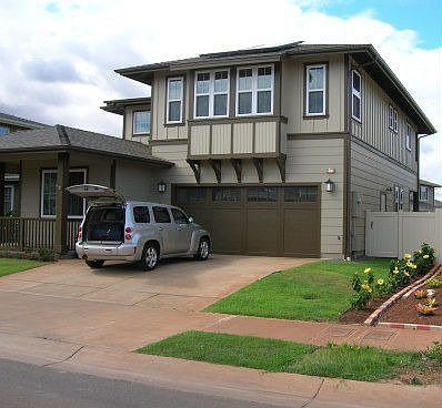 Rare 5 bedroom Plan 3 Kalaeloa model home in beautifully maintained Ewa by Gentry Haleakea Subdivision. Great open floor plan concept downstairs perfect for entertaining. Home nicely situated near walking/jogging paths, Park/dog park, busline, shopping center and away from the main road. 5 bedroom 3 full bath (1/1 downstairs) home generously upgraded with a little bit of everything. Freshly painted exterior, OWNED PV system (18 330 Watt panels), Solar hot water heater, wood laminate flooring, brand new carpet in all bedrooms, plantation shutters, SS appliances, Closet systems, larger 2 car garage big enough to fit an extended cab truck and bed, added outlet for backup generator to run the big items in the house, larger porch and lanai, huge landscaped lot with plenty of room for the children and furry friends. Clean and ready to move in.