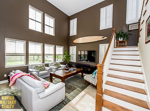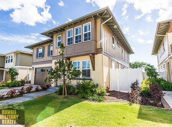 Assumable 30 yr fixed VA Loan @ 3.75%! VERY EASY to SEE. Located on the preferred side of Hoakalei Country Club facing southwest on Kaiokia St. in Ka Makana at Hoakalei. This golf course frontage home overlooks the 8th green and has a view of the new country clubhouse. The home is a 65.10 model with a bedroom and full bathroom on the 1st floor. There is a yard large enough for an in ground swimming pool and spa. This home also features an extended backyard lanai with custom stone work and the inside of the home has Travertine tile downstairs (NO CARPET!), plantation shutters, a built in office in the loft on 2nd floor, blackout curtains on south side of house on both 1st and 2nd floors, built in closet systems and too much more to list.