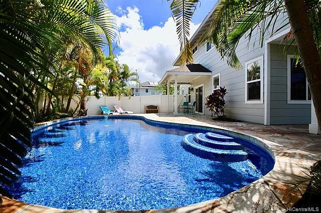 RARE OPPORTUNITY in the desired Ocean Pointe community. This is not your typical 403 model! This beautiful pool home sits on a larger corner lot with rear guest parking. The home offers tile flooring throughout the main living area & wood laminate on the stairs and hallway. Newly upper grade carpet in the bedrooms. This home features central AC, stainless appliances, corian counter tops, 2" window blinds, solar water heater, 3 covered lanais (unique to this community) and a 3 car garage (1 has roughed in plumbing for option studio). Relax by your LARGE ???FULLY TILED??? GUNITE POOL that???s surrounded by tropical vegetation. The home is located close to a number of golf courses, shopping, restaurants and the second city of Kapolei.