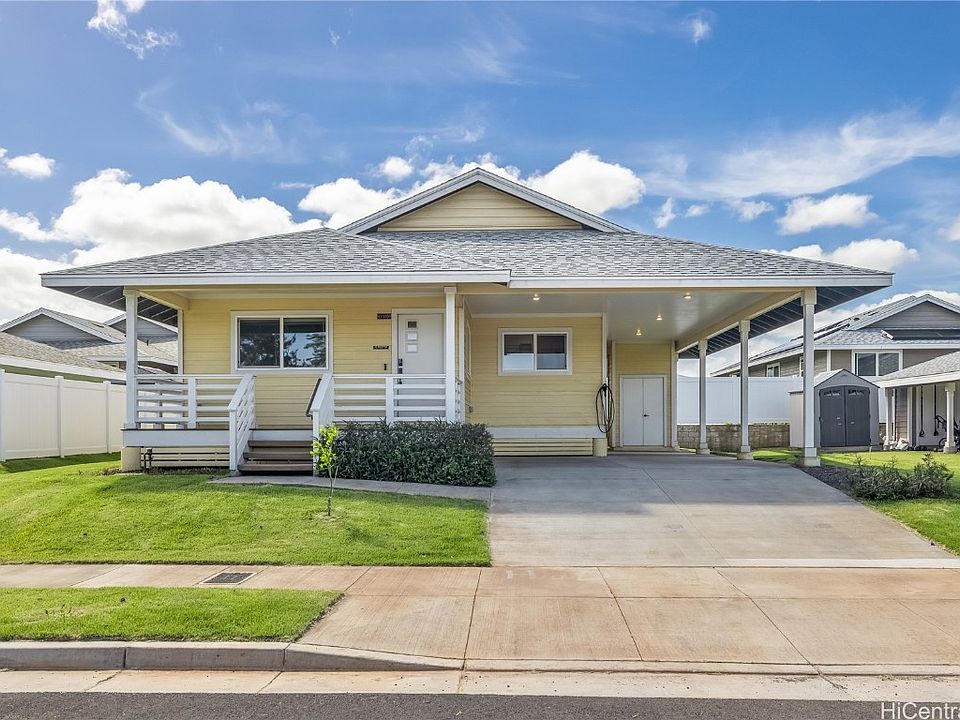 Welcome to the community of Ho’opili Ho'oulu neighborhood in Kapolei on the West side of Oahu. The homes in this small neighborhood are single level plantation style with yards and sidewalks located near the park, Community Center and Pool with easy access to shopping, schools and Ho’opili Rail station. This home has five parking spaces, three in the carport and two in the driveway. EV Car Charger is installed. The welcoming covered front porch is a great place to relax, sip your favorite drinks and entertain the neighbors. Enter the home via a foyer leading to the living area and kitchen. The kitchen is appointed with stainless steel appliances and a peninsula which is great for bar seating at the counter. The primary bedroom has an ensuite bath with a stall shower and a huge safety walk-in closet. Features include split air conditioners, quartz counters, luxury vinyl plank flooring and wall-to-wall carpet in the bedrooms. Seller is providing additional vinyl flooring for the bedrooms for future install plus an 86" wall mounted TV. This home is only one year old, like new! Come home to Kapolei. One or more photos have been enhanced.