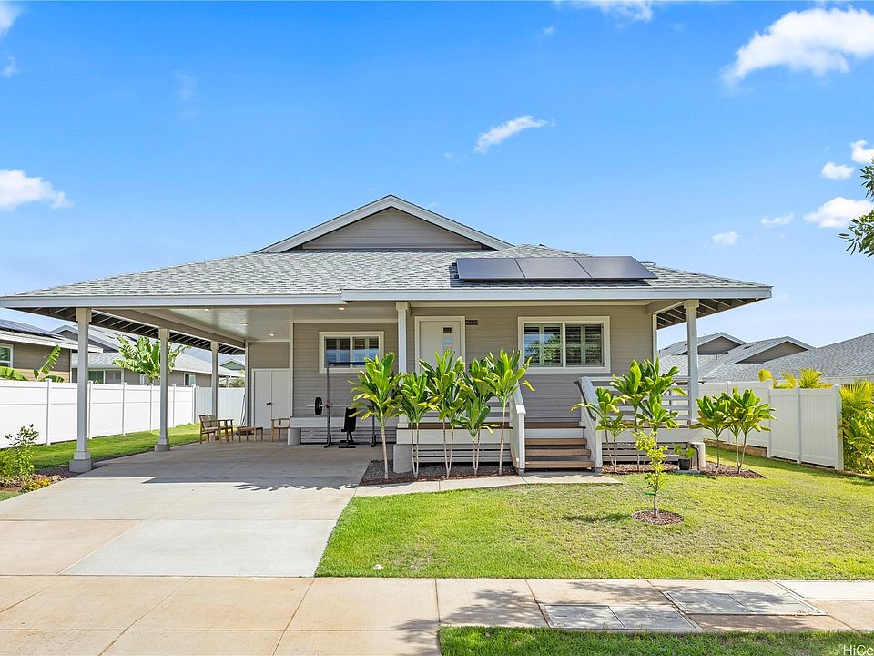 Experience the perfect blend of island charm and modern luxury. Located in one of Hawaii’s most desirable communities, this beautifully designed home pays tribute to Old Ewa Village’s plantation-style heritage while offering every modern convenience. Built just over two years ago, it welcomes you with an expansive carport, inviting lanai, and stunning curb appeal. Inside, enjoy fresh interior paint, new luxury vinyl plank flooring with modern baseboards, and custom plantation shutters on every window. Split A/C units in each room ensure year-round comfort, while the kitchen shines with pendant lighting above the island, an upgraded refrigerator, and designer finishes. Every detail has been elevated, from added overhead lighting and a ceiling fan in the living area to a hidden TV outlet for a clean, polished look. Smart-home features include a 360° security camera system and keyless entry. Fully paid solar panels and a Tesla battery provide energy efficiency and peace of mind. Perfectly located near parks, the community center and pool, and the new rail line—this move-in-ready home embodies modern Hawaiian living at its finest.