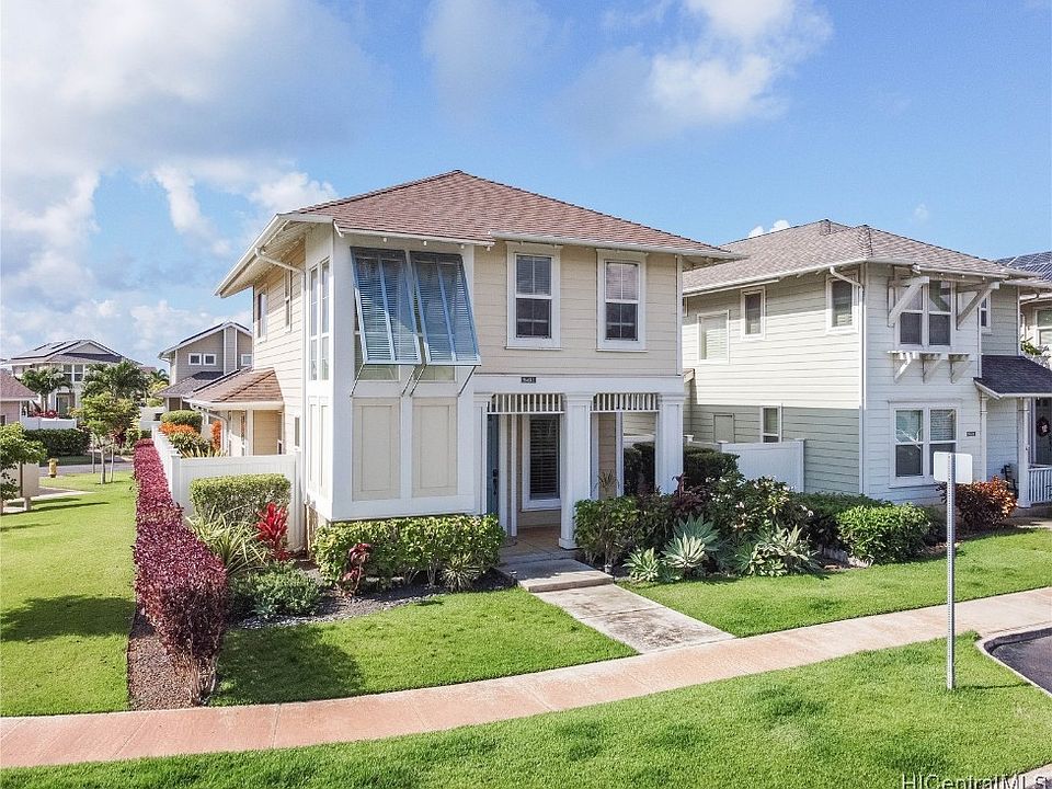 Beautiful corner lot 4 bedroom, 2.5 bathroom w/loft SF home located in the gated community of Kipuka at Hoakalei. This former Model Home is highly upgraded and features a primary bedroom w/bathroom located on the first floor (only model in Kipuka), hardwood flooring (1st floor), custom paint (throughout), solid wood cabinets (kitchen/bathrooms), tiled mosaic backsplash (kitchen/bathrooms), DAL Stone tiles (kitchen/bathrooms), quartz countertops (kitchen), shutters and custom window coverings (throughout), upgraded carpet in the bedrooms and loft (upstairs), filtered water w/reverse osmosis, and a professional landscaped yard. HOA fee includes front yard maintenance (grass only), cable, internet, phone, use of the community pool, hot tub, and access to the private Wai Kai Hale Lagoon. 2.75% VA Assumable Loan!