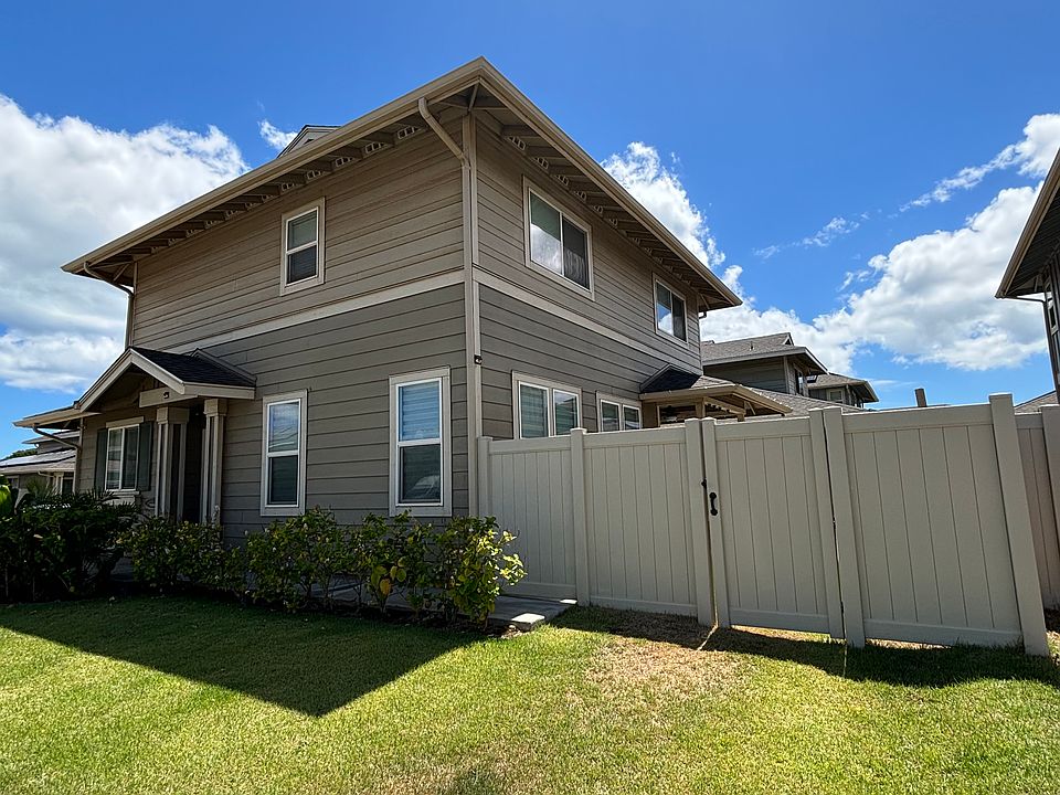 Welcome to this stunning 3-bedroom, 2.5-bath single-family home located in the desirable Haakea neighborhood at Ho opili. Key Features: Upgraded Interiors: Custom blinds provide privacy and style, while the upgraded vinyl plank flooring throughout the home ensures a clean and contemporary look. Upgraded garage storage system with ceiling storage and side storage to store all your holiday decorations and beach gears. Outdoor Living: The fenced yard offers a safe and private space. A concrete-paved sitting area in the backyard is perfect for relaxing or entertaining. Convenient Location: Situated close to Ka Makana Ali'i Mall, UH West O ahu campus, Costco, Walmart, the Kroc Center, and all that Ewa Beach and Kapolei have to offer. You'll also appreciate the short distance to Konane Neighborhood Park and the future community center, adding convenience and community vibes to your lifestyle. No smoking allowed, renter is responsible for water the side strip of the common, and the utilities.
