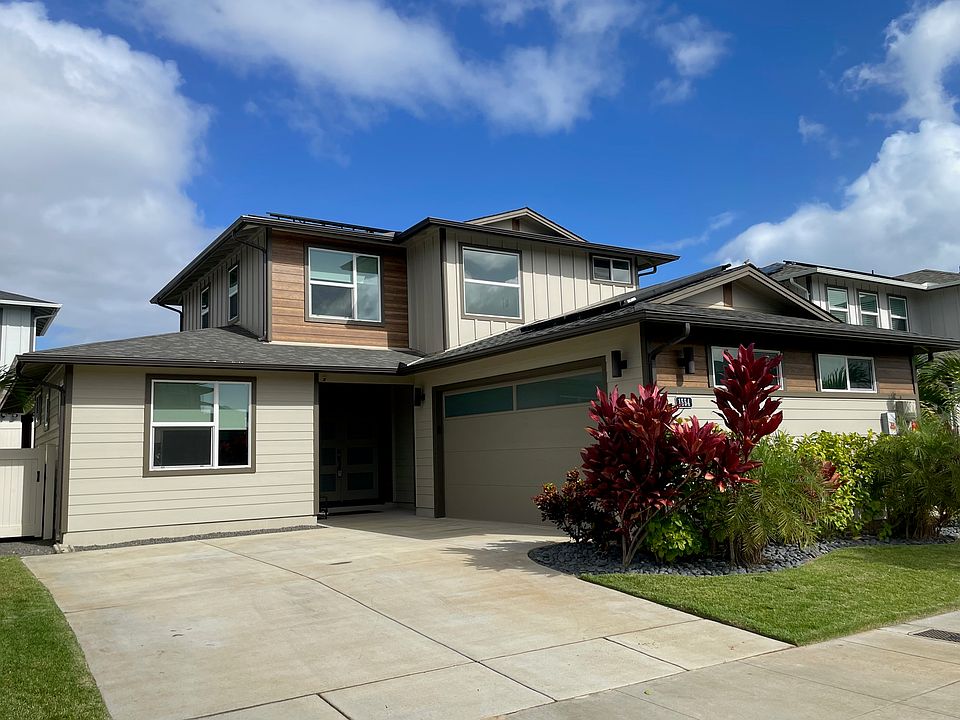 Beautiful 4-year-old, 2-story home with central air conditioning and PV system powered by a Tesla battery. Open concept living! Kitchen, dining, living area, guest bedroom, full bathroom and laundry are on the main level & upstairs are 3 bedrooms & 2 bathrooms. Vinyl laminate flooring throughout for easy cleaning. Enter from your 2-car garage into your kitchen, great for groceries. Kitchen has solid surface countertops for easy cleaning, lots of soft close cabinets, stainless steel appliances and walk-in pantry. Dining area has sliding door to access your covered patio and fully fenced yard to enjoy indoor/outdoor entertaining. Spacious primary bedroom with ensuite and walk in closet. Other 2 bedrooms have multiple windows, and one has mirrored closet doors. Full size washer and dryer. Possible to fit 4 cars in your driveway plus street parking. This spacious home is located in Ewa Beach! Ewa by Gentry is a planned community with a community pool, playground and large open field. Few blocks away from grocery stores, Longs, restaurants, gas stations, and more. Minutes to the beach, H1 freeway, and shopping. Approximately 30-40 minutes to all military bases. 1-year rental term to start. Available Mid-February. Property rented unfurnished. No smoking. Dogs' negotiable on a case-by-case basis. Yard service included. Rental includes solar and trash fees. 2 car garage. Offered for rent by Island Hale Property Management LLC. License No. RB-22992.
