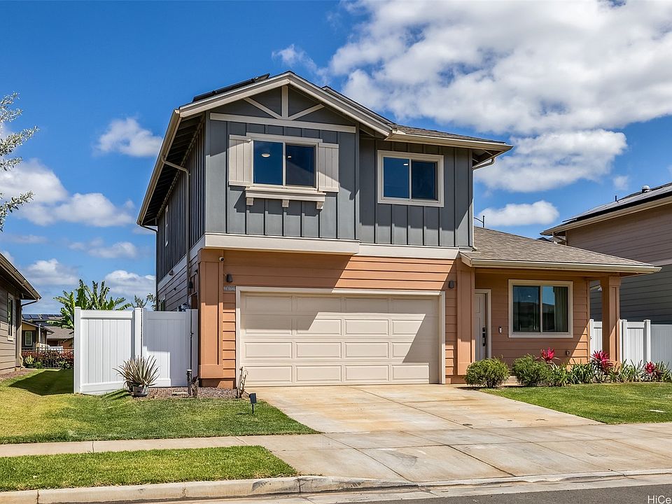 Beautiful 4 br/2.5 two story single family home in one of Hawaii's fastest-growing community in Ho'opili. Barely over 3 year- old Grove model in Ho'opili Lehua community, with vaulted ceiling and lots of upgrades from seller owned/fully paid 20 panels of photovoltaic system with 1 Telsa power wall battery, recess lights all throughout, fully fenced yard for your privacy, ceiling fan with remote control.The modern kitchen boast modern finishes with stainless steel appliances. Split A/C's in all bedrooms, living and family room.The house comes with a luxury vinyl flooring on the lower floor with plush carpeting on the upper floor. Seller to leave google nest security system. Nicely maintained landscaped backyard with access to the quiet street behind the house for your morning and afternoon walk. The back yard is ideal for your family/friends gathering event.Access to fantastic amenities, including community pool, recreation center, basketball and soccer field and many more amenities to come. Near Kamakana Mall, UH West Oahu, Kapolei Rail Terminal. Kapolei Commons is nearby. There is only 2 homes listed in Lehua community, act before it's too late. First OH Sun 3/9 from 2-5pm.