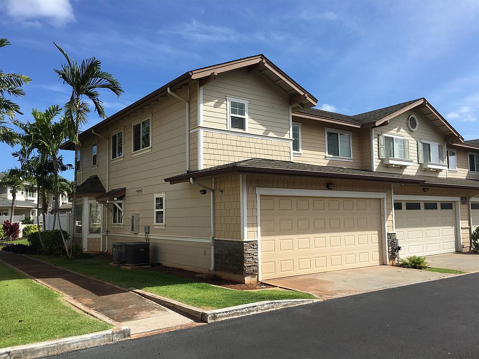 End unit offers additional windows for great natural light. The interior of the unit features laminate flooring on the first floor with the living room, dining room, kitchen and half bath. The carpeted upstairs has 3 bedrooms and 2 full baths. Central A/C, 2 car garage, and washer/dryer are included. Close to swimming pool. 1 year rental agreement to start. Rent includes yard service and trash fees. No smoking. One small pet is negotiable on an individual basis. We do not accept Section 8. Offered for rent by Honolulu Property Management, LLC. License No. 21164. Spinnaker Place Townhomes is located in Ewa Beach. This newer neighborhood is conveniently located 5-10 minutes from grocery store, dining, golf courses, and gas stations. Property features swimming pool, bbq grills, and guest parking.
