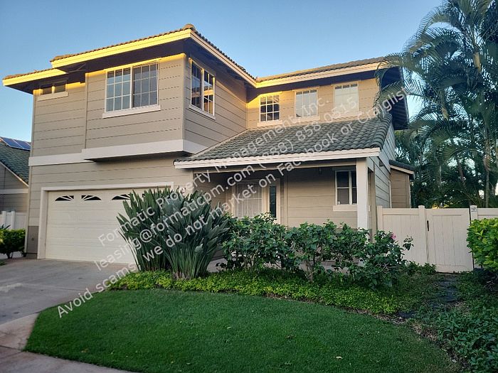 Golf Course Home in the desired gated community of Hu'elani! Modern 2 level home with attached garage has 3 bedrooms, 2.5 bathrooms and features a spacious floor plan, high ceiling in the living room, upstairs laundry, and a large fenced in backyard. Wood laminate flooring throughout upstairs with tile downstairs. Stainless appliances in the kitchen with the exception of the dishwasher. New cabinets, granite counter tops, wet-bar, and wine cooler. Pet cubby room beneath the stairs opens from the entry hallway with a small pet door entering the living room. Feel like you're on vacation every day by enjoying the Hu'elani pool and cabana, BBQ and party areas, fitness center, and relaxing in the hot tub. Short distance to schools, parks, shopping centers, bus stops, and Ka Makana Ali'i mall. Doctors and Queens West Hospital are 4 miles away. Beautiful landscaping in the community and HOA cares for the front yard. Resident responsible for side areas and back yard. Central AC system installed July 2024. Solar water heater. Small pet must be approved and meet HOA requirements. HOA pet policy is two per household. Pet registration with HOA is $42.95 for the first and $85.95 for the second pet, paid directly to the HOA (prices could change without notice). Pet fees will be applied for each pet, depending on their pet screening score at http formatic. Formatic's application process is based on first-applied and first-qualified. If you apply and there's already an approved application, Formatic will refund your application fee or you can choose another one of our rental properties at no additional cost! If the application before yours is denied or incomplete, and you're next in line; we will proceed to run your application and background screening. Formatic won't run your credit or background until we have the entire group's application and you're next in line. We do not accept third party applications. Available - Move-in Now! Rent: $3,745 Application Fee: $55.00 Security Deposit: $3,745 Appliances included: Stove Fridge Over-the-range Microwave Dishwasher Washer Dryer The lease start dates occur within 21 days of approval. Gross income must be a minimum of 3x the rent. We strongly recommend to tour the property before applying. Additional fees may apply, including but not limited to: TenantClear SecondChance Program Fee: $25 to $55/month for non-qualified applicants who would like to still rent the home. Residents Benefit Package: $50/month includes Pest Control. Professionally managed by Formatic Property Management, Inc., offering excellent customer service, the latest in technology, online applications and payments, and pet-friendly options. The information contained herein has been obtained through reliable sources but cannot be guaranteed its accuracy. Any information of particular interest should be verified with Formatic Property Management, Inc. This property allows self guided viewing without an appointment. Contact for details.