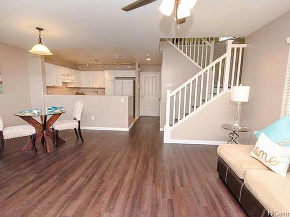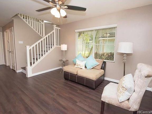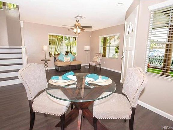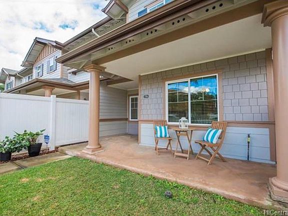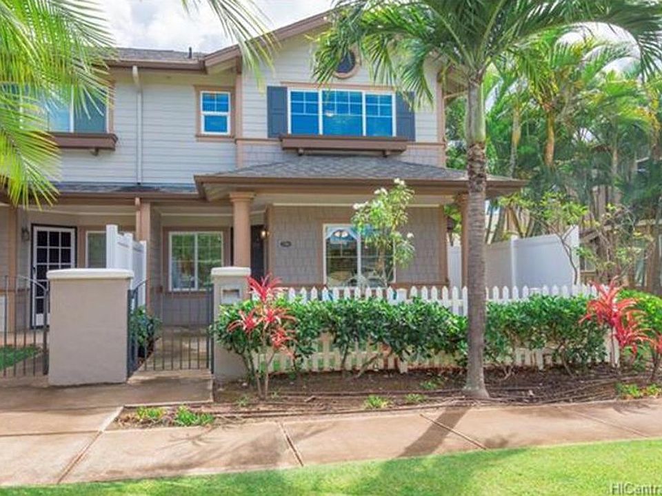 Located in the community of Town Homes at Fairways Edge in Ewa Beach, this 3 bedroom, 2,5 bathroom corner unit is turn key and ready for a single professional, couple, or beautiful family. Offering a 6 month lease with the possibility of renting month to month following. This recently remodeled property has new ceiling fans and light fixtures, vinyl planks throughout the main living areas, stairs, and landing. Carpet only in the bedrooms and tile in the bathrooms and kitchen area. This home has an open floor plan and a 2 car garage. All appliances are in unit: washer, dryer, dishwasher, refrigerator, microwave, etc. Walking distance to Laulani Villages Shopping Center, community pool area, and walking path down Keoneula Blvd. Community amenities include a pool, spa, and grills. Comes with one year of American Home Shield home warranty. Pet friendly per owner approval. WHAT I LOVE ABOUT THE HOME My home is an end unit that allows plenty of sunlight into the space! It has been remodeled with a nice neutral tan color wall paint, white floor boards, and dark brown wood look vinyl laminate flooring (Stillwater Oak) that sets off the tan walls and white trim throughout beautifully. My location is convenient to schools, shopping, gas stations, and beautiful Ewa Beach is within walking distance. The grounds of the complex are a tropical paradise and the pool/hot tub/grill area is right behind my home. There is plenty of storage in the built-ins, spacious closets, under the stairs as well as the garage area. Beautiful home, beautiful landscaping and convenient location! Owners pays for water and trash. Tennant pays for electricity.