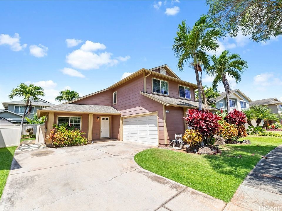 Welcome to this stunning 3br / 2 ba home on two levels in desirable Ewa by Gentry Prescott! Enjoy cooling central A/C throughout, a spacious 2-car garage and a large concrete driveway for additional parking space. The living area greets you as you approach the house, giving it the ideal setting to host guests. An island countertop in the lovely open kitchen offers plenty of room for meal preparation and casual dining. All bedrooms and full bathrooms are on the second floor. The backyard is a naturalist's paradise, with a wide open grassy lawn and tropical plants that offer a calm and tranquil atmosphere for relaxation and outdoor activities. The well-maintained patio is the perfect spot for enjoying barbeques, entertaining guests, or simply unwinding after a long day. Numerous attractions like golf courses, white sand beaches, an abundance of shopping, leisure and restaurants are within close proximity. Indulge in exciting events and activities hosted by the Ewa by Gentry Community Association. This is a wonderful opportunity to own a move-in ready home on the sunny side of the island.