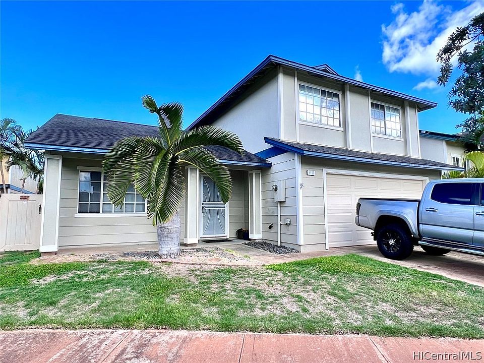 $10,000 credit to Buyer for closing costs or points. Spacious home located on quiet street at end of cul de sac in Ewa Gentry Prescott. Large useable yard space makes this a unique property. Vaulted ceiling downstairs. 1 bedroom and 1 full bath downstairs and 3 bedroom 2 full bath upstairs. Kitchen has solid surface counter tops, central A/C, solar for heating water and new washer/dryer. Fully fenced yard which is perfect for pets. All appliances included.