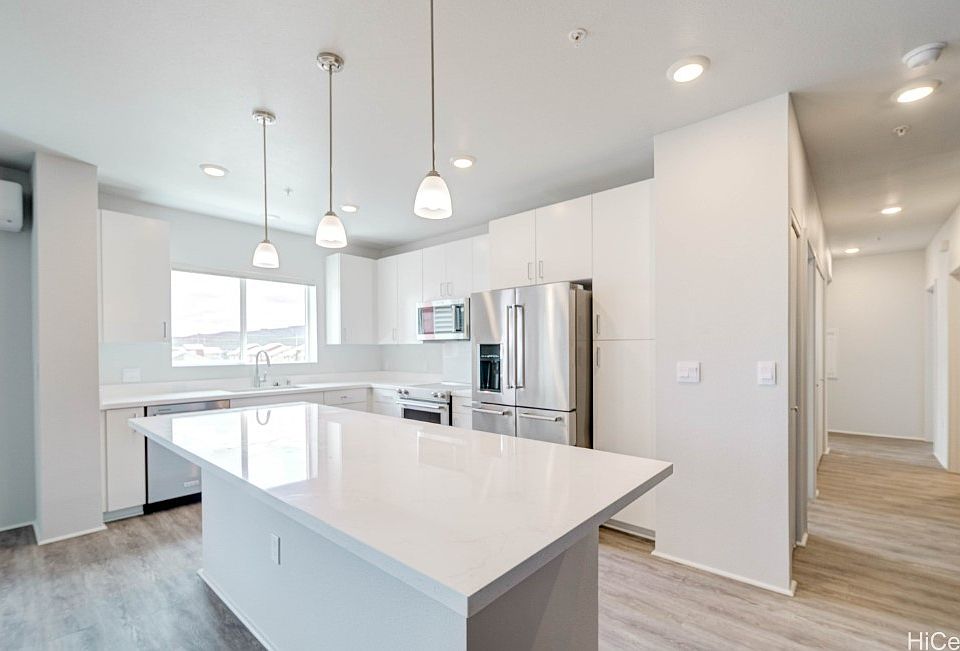 New condo complex Nahele at Hoopili offers convenient, modern living. 4-5 story elevator buildings featuring 1, 2, and 3 bedroom flats. Just a block from the Hoopili rail station. Numerous upgrades including Viaterra Quartz countertop in kitchen and Kitchenaid kitchen appliances. Whirlpool Gold front load washer and dryer. High efficiency split A/C. Luxury vinyl plank flooring and upgraded carpet in the bedrooms. Condo includes a Smart Home system with Qolsys IQ4 Panel, Deako Smart Switch, Kwikset Lock, Amazon Echo Dot, and Doorbell Camera. Builder warranty adds peace of mind. This second floor 3/2 comes with one car garage and one additional assigned parking space. The master planned community of Hoopili offers wonderful amenities including a pool.