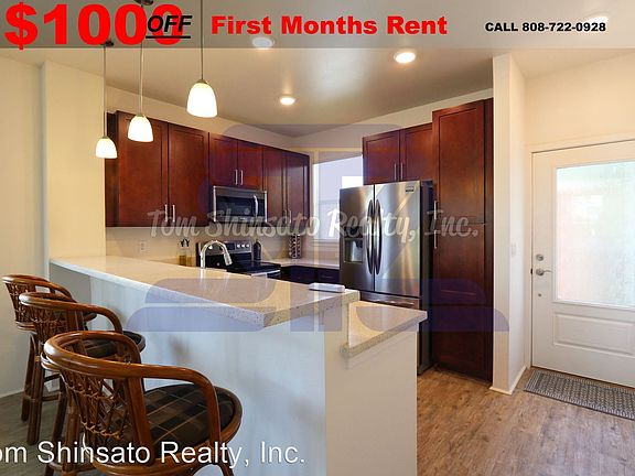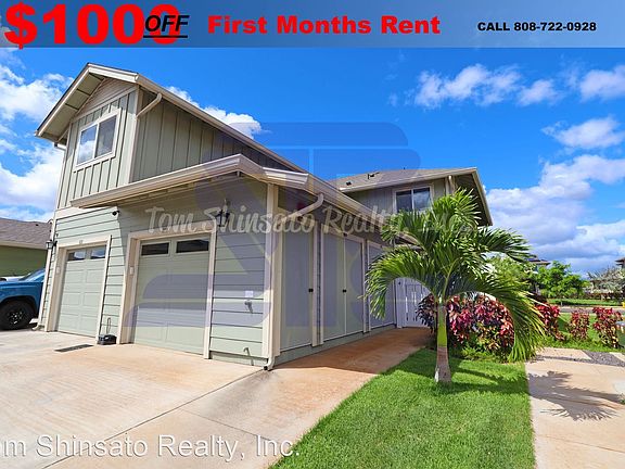 $1000 OFF First Mo. Rent! Beautiful Condo in Haloa at Hoopili - Near the newly opened Konani Park, and Kroc Center. Spacious living and dinging room area with pendant lighting. Features include stacked washer/ dryer, a/c, dishwasher, ceiling fans, refrigerator, range/oven, and blinds. One car garage and one uncovered parking, plenty of guest parking. Near Ewa Villages Golf Course and minutes away from Ka Makana Ali'i for shopping and dining convenience. Short drive to Pearl Harbor/Hickam, Schofield, Wheeler! Be apart of Ewas newest community Haloa at Hoopili! RENTAL FEATURES Range / Oven Ceiling fans Granite Counter tops Refrigerator A/C Dishwasher LEASE TERMS First Mo. Rent: $1400 (see details below) Monthly Rent: $2400 Security Deposit: $2400 Lease:1 Year Pets: Allowed(see pet policy) Smoking: Not Allowed Renters Insurance: Required Application Fee: $25 per adult PET POLICY Rent/Pet Fee: $50/mo. Pet Security Deposit: None Weight: 25 lbs max Breed: Restriction Apply Renter's Insurance: Required CONTACT INFO Tom Shinsato Realty, Inc. 1744 Liliha Street Suite 306 Office Hours: Monday-Friday, 8:00 am-5:00 pm Please visitwww.shinsatorealty.com Follow us on Instagram & Facebook @TSRHAWAII DISCLAIMER Rental prices, discounts, availability & lease terms are subject to change without notice. Discounted rent offers do not include parking, utility, or pet fees. Any discounts offered for this unit are subject to qualifications. Pictures displayed may differ from actual unit. Furniture used in photos are for staging purposes only unless otherwise specified in ad. Square footage of unit are approximations. All information deemed reliable but not guaranteed. Do NOT contact me with unsolicited services or offers. WARNING! WIRE FRAUD ADVISORY: Wire fraud and email hacking/phishing attacks are on the increase! Confirm all wiring instructions independently with a trusted and verified phone number or person before transferring funds. (RLNE5968868)