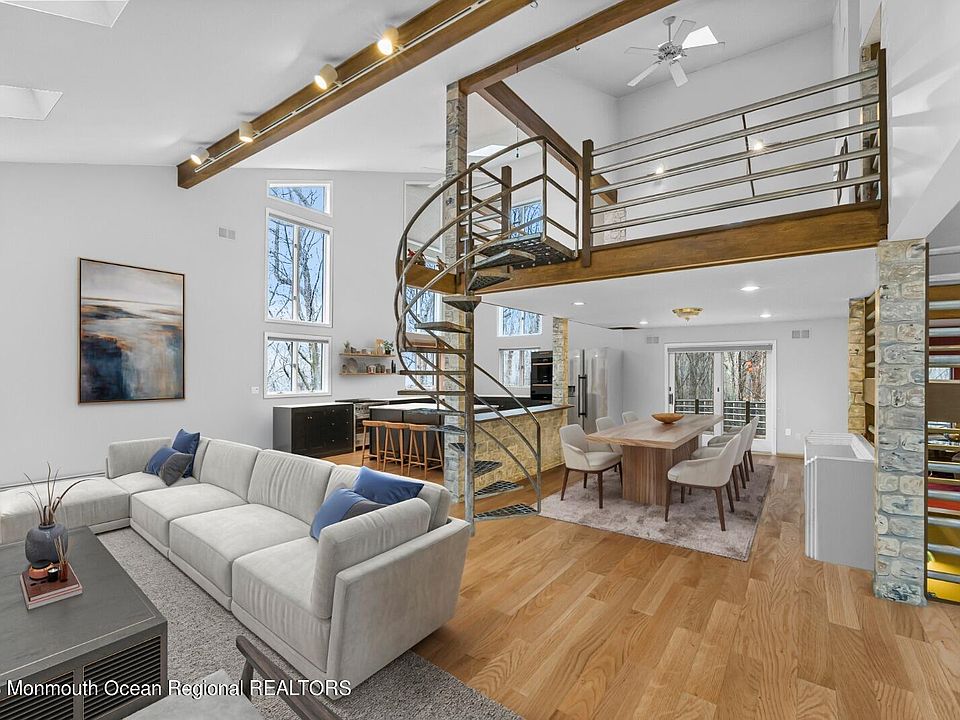 This home includes a 1 yr warranty. If you've been looking for a modern home surrounded by privacy then look no further. This 4 bed, 3.5 bath home was custom built by the owners for themselves & you can tell because the quality & craftsmanship is undeniable. Features include spacious open floor plan, vaulted ceilings, recessed lights, 10 motorized skylights w/auto close, Anderson windows & doors, spacious kitchen w/20 ceilings, center isle Jenn-Air grill w/exhaust, subzero refrigerator, 3 wood burning fireplaces, 1st floor offers 2 bedrooms & 1 1/2 baths. Spectacular sunroom off family room for all your entertaining needs & an additional great room to top it off. New gas furnace & HWH. 7 Zone Heat/3 Zone AC, upper/lower separate central vac systems, 2nd floor laundry. Additional spiral staircase off kitchen to 2nd floor loft overlooking 1st level, offers sliders to upper deck. Sliders off dining room and living room to western red cedar wrap around deck. Second level offers sunken master bedroom w/vaulted ceilings, recessed lights, full wall wood burning fireplace and sliders to deck. Master bathroom has vaulted ceilings, motorized skylight, stall shower, jetted tub, bidet, and walk in closet . The 2nd bedroom is a spacious guest suite w/attached full bath. Walk out basement w/fireplace, sliders to stamped concrete patio overlooking gorgeous wooded surroundings. Roughed in plumbing available for additional bath. 3 Car garage has workshop, heated & cooled, additional storage & 9 wide garage doors to fit your largest vehicles. 400 AMP electric service. This home sits upon 3.6 acres & has a quarter mile trail for your your enjoyment. Close to shopping, restaurants, all NY transportation, restaurants, & schools. It's also conveniently located 30 mins from the Jersey shore. This unique property is not one that you will want to miss.