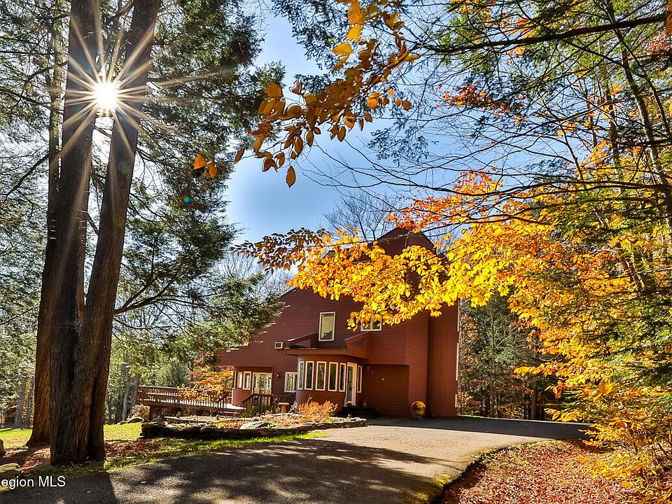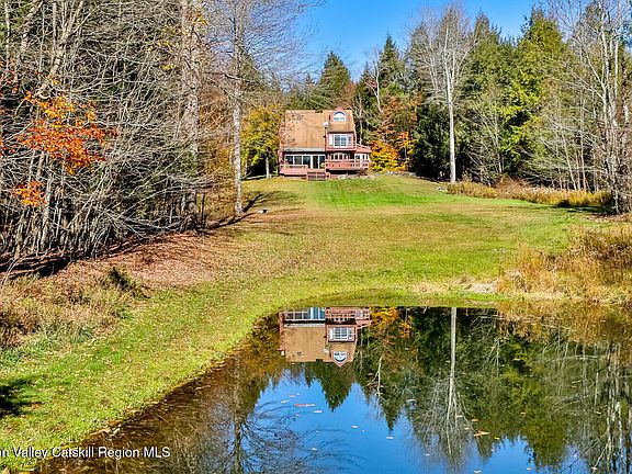 Enchanting Windham 4 bedroom, 3 bath home on a serene private setting. From the moment you enter the driveway, you know you have found something special. This sun-drenched home offers classic modern design. The open vaulted living area with wood burning fireplace, built in bookcases offers plenty of room to relax and contemplate the peaceful views through the expensive windows and sliding doors out to the oversized decks taking in your private pond and meadows below. Lovley dining area and kitchen also offer beautiful views to outdoors and garden. A delightful mudroom, foyer and cozy first floor bedroom and large full bath round out the first floor. The upper level brings you to a stunning primary bedroom with spacious ensuite full bath and sliding doors out to a private balcony with gorgeous views down the meadow. The third bedroom on second floor is currently being used as a study, a fourth bedroom plus third full bath gives you plenty of sleeping options for family and friends. This unique property also offers separate oversized 2 car garage with unfinished loft area, house generator, new septic system (Dec. 2025) and installed radon mitigation system. Come be enchanted with the abundance of nature and beauty this special home has to offer! Located within minutes to the charming town of Windham and Windham Mountain ski area. Explore the local restaurants, hiking trails, biking, day spas, indie bookstore, local shops, farmers markets, theatre and music events for a four-season haven! The seller will be able to close after April of 2026.