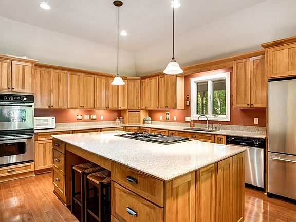 Farmhouse style home with a guest cottage! Tucked in the trees, this home offers a lovely covered porch that wraps the entire house to enjoy the private setting rain or shine. The guest cottage has a covered front porch too! Main house boasts a wonderful oversized kitchen open to family room. The HUGE island with JennAir gas range allows room for the entire family to gather around and enjoy the cooking experience. Double ovens and cabinets galore! Perfect kitchen for entertaining and the sitting area welcomes with lots of windows for enjoying the outdoors and opens to large covered back porch. Wood stove insert allows you to enjoy the cozy warmth of wood heat should you prefer. Upper level offers two spacious bedrooms with walk in closets and a full bathroom! Basement level has additional bathroom, 3 bonus rooms and a laundry room/workshop area. A Large utility/workshop is also available on lower level. The Guest Cottage was built in 2004 and is such a wonderful addition to the property. Bring the parents, the college student, the nanny, etc. Guest cottage has full kitchen, 1 bedroom, an office and laundry all on one easy access level. 3 car garage on lower level.