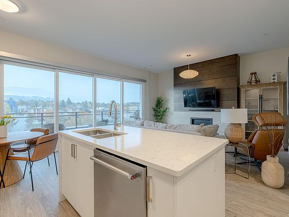Executive corner-unit suite with panoramic mountain and ocean views in the heart of downtown Nanaimo. This 2-bed, 2-bath West Coast–inspired home features a refined primary suite with a walk-in closet and a spa-like ensuite with dual sinks and a glass walk-in shower. The open living area boasts 10-foot ceilings and 16-foot retractable glass doors that fill the space with natural light and open to a large south-facing balcony with a gas hookup. High-end finishes include a gas fireplace, stainless steel appliance package with gas stove, Caesarstone waterfall countertops, European soft-close cabinetry, and Grohe faucets. Added conveniences include roller shades, a new heat pump, secure underground parking and storage, plus bike, kayak, and paddleboard storage. Residents also enjoy a landscaped communal courtyard in one of Nanaimo’s most desirable downtown locations. Measurements are approximate; verify if important.