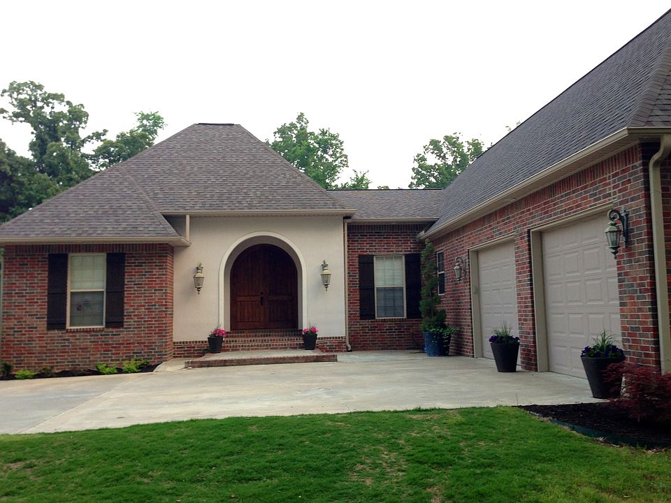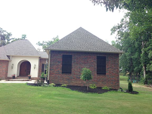 European style; 12/12 and 14/12 pitch roof; J-drive; 9-foot garage doors; rustic inside; extensive crown molding in living room, dining room, and breakfast room; 18x18 living room; 18x18 master bedroom; 16x18 master bathroom with his/her closets, large shower, and space for claw-foot bathtub; large walk-in closets in the 2 13x13 bedrooms; split floor plan; turnaround in the double-wide driveway; wooded lot on 2 acres with large oak trees situated on a hill; partially finished full basement which includes a full bathroom, large 18x22 playroom, stained concrete floors throughout, 3 full bedrooms with large closets--one with a walk-in closet--, a closet under the stairs, 3 extra large closets, mechanical room, living area with open kitchen floor plan, unfinished area for storage, walk-out French door up shallow stairs; next door to the country club; quiet subdivision just one mile from the hospital right outside of the city limits.