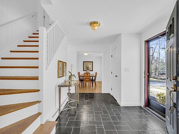 Set on a scenic 1.1 acre lot abutting protected land, this well maintained, 2,500 sq ft home on a welcoming cul-de-sac location with hardwood floors throughout is highlighted by a spacious main level of gathering rooms including the large front-to-back living room, the bright, welcoming family room, well-proportioned dining room and a fabulous sunroom offering natural views through every window. Upstairs finds 5 bedrooms with the primary suite showcasing a cozy fireplace and double closets. Upgrades include a 35-year architectural roof, Anderson windows, Buderus natural gas boiler (2003), hot water heater and new laundry machines in the convenient main-level laundry room. Recently replaced appliances adorn a great eat-in kitchen. Spacious 2-car garage offers room to expand in an unfinished space over. Sidewalks to elementary and middle schools, White Pond and Verrill Farm. Convenient to major commuter routes. A fantastic house in a vibrant, well located location.
