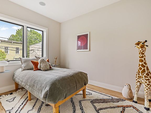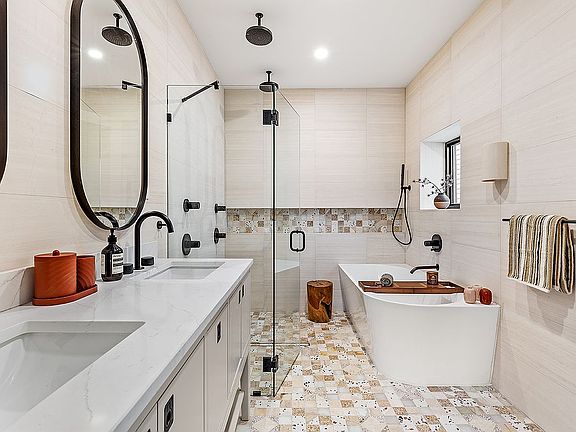 The second floor features three beautifully appointed bedrooms. The serene primary suite features oversized windows, a wall of closets, and a spa-inspired en suite bath with double sinks, custom terrazzo and travertine mosaic flooring, a soaking tub, and a double shower. Two additional bedrooms offer versatility, with potential to accommodate guests, a home office, or other needs, with a shared designer bathroom.