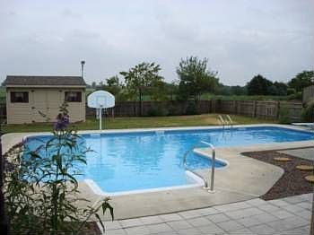 Cool off in your own pool - large enough for volleyball, basketball and diving. Open floor plan on first floor.