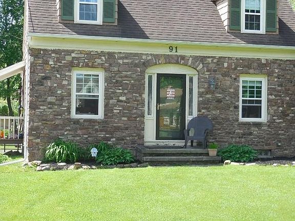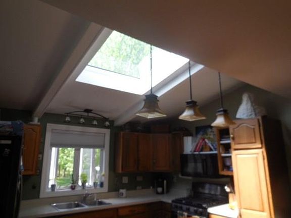 Spacious 3 bdrm Cape Cod, 1.5 baths, Master and half on 1st floor; Beautiful stone front w/1 car detached garage in back of house, Huge Vaulted Kitchen; skylight 3+- years NEW Black Stainless Steel appliances included; island not included w/chairs, New comfort vinyl Windows throughout, New furnace, Formal dining room & living room with wood burning fireplace with Enclosed heated porch; some ceilings fans; 2 window a/c units included, custom blinds, no garage door opener; patio; beautiful backyard; new sump pump, Large 2 bdrms upstairs with full bath; & security system; new front storm door.