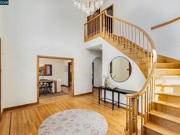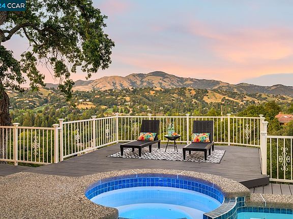 Reduced $400k... Custom-built home, offering breathtaking views from every angle. Step into elegance as you enter the formal foyer, double-high ceilings & curved staircase. The formal dining w/ recently refinished wood flooring & living and family rooms have dual fireplace, creating a cozy ambiance for gatherings. Family room has wet bar & sliding doors leading to the expansive deck, perfect for outdoor enjoyment. The large kitchen is a chef's dream, featuring a center island with sink, Viking stove and oven, new microwave, trash compactor, additional oven & warming drawer. The primary suite upstairs, boasts a balcony & luxurious bathroom with a large jetted tub. Two additional bedrooms, a Jack & Jill bathroom &a downstairs office provide versatile living spaces. The office can be easily used as an additional bedroom with an adjacent full bathroom. Indulge in outdoor relaxation with a newly refurbished pool boasting new tiles, heater, electronics, LED lights. Remodeled outdoor bath, newly painted decks, new skylights & owned solar. Freshly painted exteriors and interiors, including a newly painted 5-car garage. Located in the highly sought-after Alamo Highlands neighborhood and conveniently located near top-rated San Ramon Valley School District, shopping, dining, Roundhill CC.