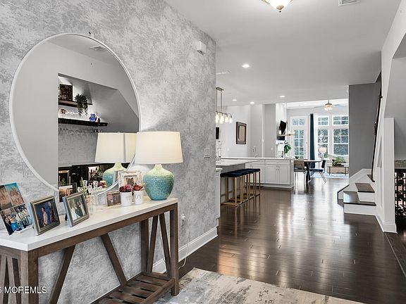 Welcome to Four Ponds- a gorgeous full amenity community located in the highly sought after town of Lincroft. This Pratt model, is a spacious and stylish 3-bedroom townhome, featuring a versatile floor plan with a dedicated office, airy loft, and two-car garage parking plus space for 2 more! Perfect for modern living, this home offers an open-concept layout with abundant natural light, sleek finishes, and thoughtful upgrades throughout.Entertain in style with a beautifully designed built-in wine bar, ideal for hosting gatherings or unwinding after a long day. The gourmet kitchen boasts GE Cafe SS appliances, quartz countertops, ample cabinetry, and flows seamlessly into the dining and living areas.... Retreat to the serene 1st floor primary suite with a spacious walk-in closet and spa-inspired bath. Upstairs, a generous loft adds flexible spaceperfect for a media room, playroom, or additional lounge/gym. Two additional bedrooms, full bath and a private home office offer comfort and convenience for both family and remote work. Enjoy your private patio overlooking a serene and private wooded area with walking trails.