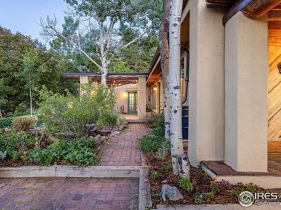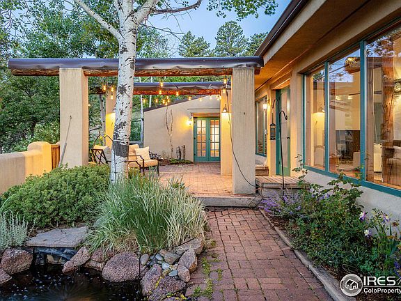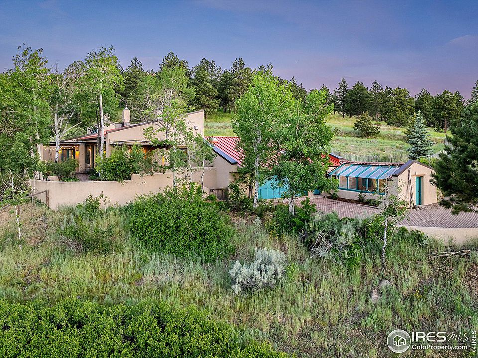 Unique southwestern charm and exquisite craftsmanship surface throughout this stunning Santa Fe-style home. Positioned south-facing on an expansive lot, this custom-designed and built residence features a warm and inviting aesthetic, amplified by an open, ranch-style layout. A stucco exterior, with a low-maintenance tile and metal roof, is complemented by a decorative concrete block driveway. Specialty features promote energy efficiency, including thick masonry walls, floor-to-ceiling windows, passive solar and brick flooring that radiates warmth from the sun. Vaulted ceilings and exposed wooden beams define the living area warmed by a cozy wood-burning stove. The kitchen showcases granite countertops and natural cherry cabinets. Retreat to the primary bedroom with an en-suite bath, each featuring kiva fireplaces. Nestled in a private oasis of perennial gardens, fruit trees and garden beds, this property boasts a greenhouse, seasonal stream, koi pond and an abundant well, crafting the perfect setting for a homesteading lifestyle.