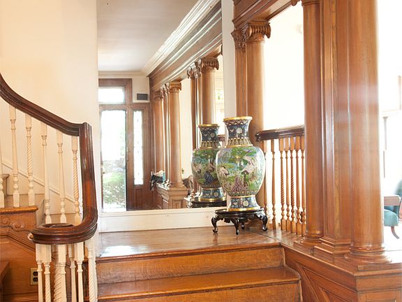This lovely well -maintained home is in the heart of Prospect Park South has a wraparound mahogany porch. Its gracious entrance with intricate, original wood columns and paneling, stain glass windows and hard wood floors. The elegant foyer has a rare central staircase that showcases this home. A grand style, spacious living room and dining room with two working fire places will meet all your entertaining needs. The first floor also boasts a circular sitting room off the foyer. A large kitchen with an amazingly, bright sun room and a large private yard. Additional features include a laundry room, butler pantry, rear stairs and a half bathroom.Second floor boasts a master bedroom suite thats is 22 feet wide with lots of natural light, two walk in closets and large master bathroom with steam shower and Jacuzzi tub. Home has three additional ample sized bedrooms and another fire place and a full bathroom.Third Floor has a 25 foot long studio space, a bedroom and a full bathroom. Skylight add additional light and space.Unfinished basement, boiler 2008, electric and plumbing have been