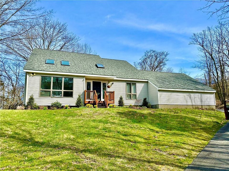 ENJOY MODERN FARMHOUSE LIVING IN BUCOLIC WARWICK, NY! Nearly 6-ACRES with tons of PRIVACY.. this serene setting awaits you! Special features of this 3-bedroom home include a FANTASTIC SUNKEN LIVING ROOM with SKYLIT VAULTED CEILING, REFINISHED WIDE PLANK FLOORS; OVERSIZED WINDOWS and EXPOSED WOOD BEAMS; a large MAIN FLOOR BEDROOM; a FARMHOUSE KITCHEN with butcher block counter-tops, new gas stove with drop down range hood and beautiful window box; a large dining area with sliders to a large 150 sq ft. deck. Down the hall you'll find a full bath and convenient laundry area followed by a large garage 24X24 (can be converted to a 2-car with larger garage door install). Upstairs you'll find an additional large bedroom; a second full bath; a large primary bedroom and skylight nook - perfect for a small office or sitting/play room! BRING YOUR HORSES (up to 3 permitted) or other animals and return the barn and fenced paddock to original use! Or, use the barn for storage, a large workshop, studio, hobby/hang out space and more!! Absolutely a lovely property with IMPRESSIVE ROCK CLIFF/WALL FEATURE that runs along the winding NEWLY paved driveway in 2023! New Roof and Skylights 2021; kitchen countertops/sink new 2022; flooring throughout the home, 2022; NEW HOT WATER HEATER, 8/23. ... Add a pool or tennis/pickle ball court!... Don't Miss this AMAZING and PRIVATE Warwick retreat or weekend get-away!! Additional Information: Amenities:Storage,ParkingFeatures:1 Car Attached,