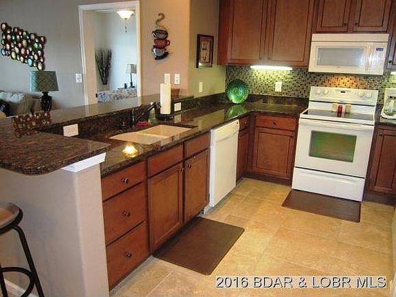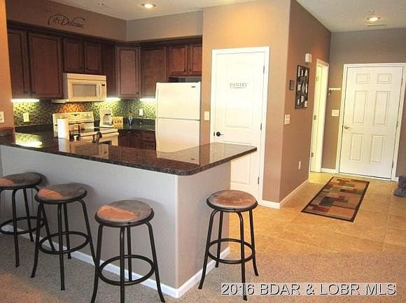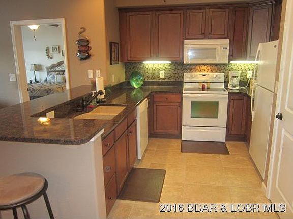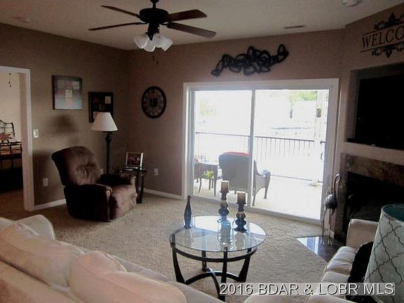 Walk-in level * Close to elevator for easy access to pool & docks * Ceramic tile in foyer, kitchen, laundry/mechanical & both bathrooms * Great kitchen w. beautiful cabinets, granite countertops, glass tile backsplash & under-counter lighting * Electric fireplace w. marble surround & hearth and built-in cavity above for large screen TV * Master bath w. 36â tall double-sink vanity & cultured marble countertop, jetted tub, walk-in shower & large walk-in closet * Guest bath w. similar single-sink vanity, walk-in shower & walk-in closet * Ceiling fans in living room & all bedrooms * Fantastic 49.5âx9.5â carpeted, screened deck w. (2) ceiling fans * 10 minutes to Camdenton * 25 minutes to Outlet Mall * 8 waterfront restaurants within 8 MI