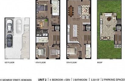 Rare pre-construction opportunity to customize this steel and concrete expansive 3331 sq ft, luxury, multi-level condo in downtown Hoboken. Unit features 4 beds, 3 full baths, large office, dining room, living room, laundry center, and a 435 sq ft private rooftop deck. 2 tandem car parking spaces included. Unit layout can be tweaked to buyers desire. Buyers can design their own kitchen, bathroom vanities, and can choose their own Quartz countertops with our designers. Appliances include 48-inch Subzero refrigerator, Subzero wine chiller, Wolf range, Wolf hood over range, Wolf microwave, Miele dishwasher, and Samsung steam washer and dryer. Private elevator access serves all floors, including the rooftop deck with outdoor kitchen, lounge space, large closet, and NYC views. The building is energy-efficient, air tight, and quiet with its concrete and steel with spray foam insulation. Each floor of the unit will have its own furnace and AC unit for true split-zone heating and cooling. Located on downtown Monroe Street, this amazing home is close to the path, bus, parks, shops, restaurants, schools, and so much more!