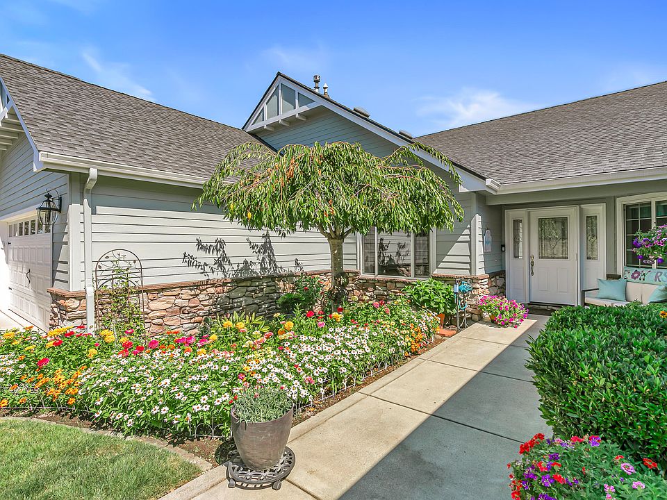 Exquisite 2-bed, 2-bath, 1,964 sq ft home in the gated Poppy Village HOA, nestled on the 14th green of Eagle Point Golf Course with stunning Mt. McLoughlin views! This 2003-built gem features vaulted ceilings, hardwood floors, and an open-concept living area bathed in natural light. The gourmet kitchen shines with new granite countertops, stainless steel appliances, and a spacious peninsula. Relax by the new gas fireplace or retreat to the refreshed primary bedroom with new carpet, paint, and a walk-in closet with spa-like ensuite. Enjoy elevated golf course views from the landscaped (artificial turf) backyard, the living areas or primary suite. Upgrades include a 2021 HVAC system, and a 2-car garage. Near top schools, parks, and shopping with easy downtown access. Move-in ready for $500,000—your dream home awaits in this prestigious gated community!