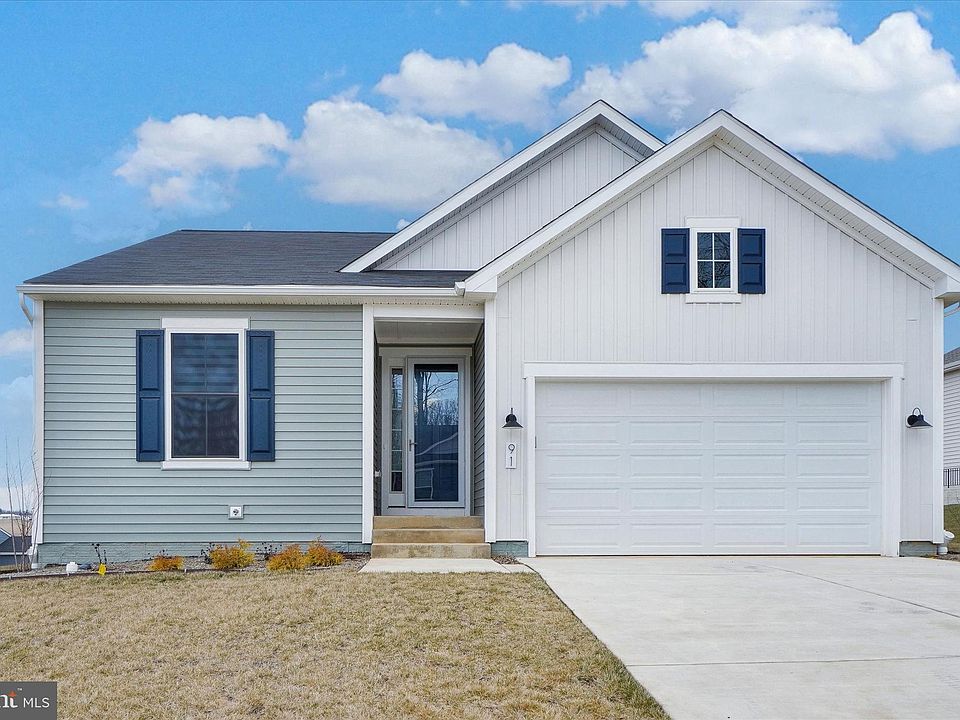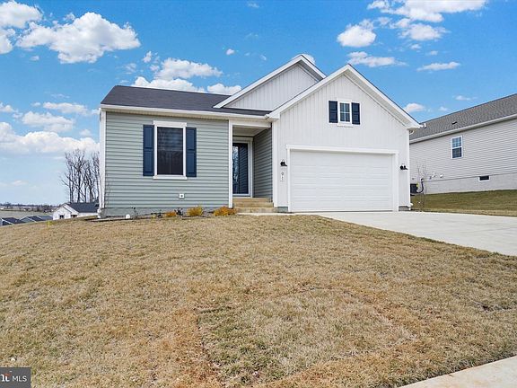Less than 1 year young. Want a new home but need it now? No need to wait, this Noble plan ranch style home with a 2 car garage was built in 2022 and includes over $49,000 in upgrades. From the entry, walk through the home to the open great room with a fireplace and a well-appointed kitchen with upgraded 42" cabinets, a center island, lighted roomy pantry, quartz counters and sink, stainless steel appliances and luxury vinyl plank flooring that leads to the sunroom. The vaulted ceiling in the sunroom and abundance of windows give you the impression of being outside. Speaking of outside, just open the sliders to step out to your rear yard. Beautiful primary suite features a barn door, a private bath with comfort height toilet, quartz vanity countertops, frameless shower enclosure and an oversized walk-in closet. Two additional generously sized bedrooms share a bath with upgraded quartz vanity countertops. Ethernet ports in the Great Room and primary bedroom, ceiling fan rough-ins in all rooms, light-filtering zebra shade blinds, upgraded carpet padding in all 3 bedrooms and a storm door with interchangeable glass and screen inserts. Laundry room/mudroom includes the upgraded oversized washer and dryer. Unfinished basement for additional space with rough-in plumbing. Rural setting but still convenient to shopping, dining and area attractions and an easy commute to I-83. All appliances convey.