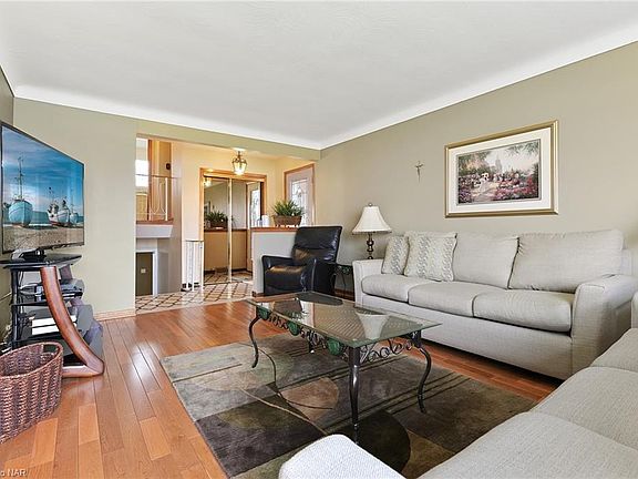 VIEW 3-D TOUR! This well maintained, original owner, 3 bedroom, 2 bathroom back split is located in a quiet but prime north Welland location close to Niagara College, Hwy 406 and all amenities! Appealing brick exterior, over sized front porch, paved driveway that fits up to 4 vehicles and an attached garage. The main floor has a large living room/dining room with hardwood flooring, huge updated windows and eat-in kitchen. Upstairs offers 3 large bedrooms with hardwood flooring, 5 piece bathroom with double sinks and extra closet storage space. Travel downstairs, you will find a spacious, cozy family room with fire place,3 piece bathroom and a separate back entrance. The lower level has a full second kitchen, laundry area, 2 cantinas and lots of extra storage space. Fenced-in backyard with large shed, perfect for a family/pets.RL1 zoning and a separate back entrance to the basement provides in-law suite/rental potential. Updated roof,(2019) windows, flooring. Furniture, gazebo(1 yr old) negotiable.
