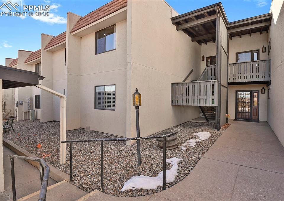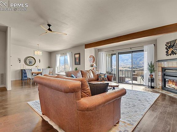 Spectacular breathtaking views of Pikes Peak & Garden of the Gods, right from your living and dining room!! Welcome home to this immaculate 2-bedroom, 2-bath condo offering 1,509 sq ft of stylish, living in the highly desirable, gated Villa Sierra community on the west side. This beautiful home has vaulted ceilings throughout that add a spacious, airy feel, while engineered hardwood floors bring a natural texture and warmth to the living areas and bedrooms. This home blends with modern updates such as a brand new electric Davinci GreenSmart fireplace insert with heat and polished finishes, along with modern lighting and ceiling fans throughout. The kitchen features stainless steel appliances and newer quartz countertops, perfectly complemented by updated quartz surfaces and new hardware in both bathrooms. Enjoy the custom-fitted laundry area with a new washer/dryer, more updates include a newer water heater, and built-in shelving. Enjoy an extra long 1 car detached garage, balcony storage closet and other surprises that are sure to delight you. Indulge in resort-style living with access to immaculate maintained grounds, boasting amenities such as a swimming pool, clubhouse, and pickle ball courts. Prime location near Cheyenne Mountain Zoo, RedRock Canyon, Old Colorado City, and numerous hiking trails. A Perfect Blend of comfort, convenience, and Colorado lifestyle!!