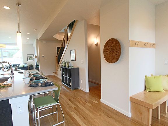LARGE ISLAND, STAINLESS STEEL APPLIANCES AND SOLID SURFACE COUNTERTOPS: Prominent glass, the flat roof and contemporary architectural lines spell star power for the duplexes created for the bold and pleasing streetscape in Prospect New Town. Huge front-facing windows in the living area and in the upper level master suite accentuate the feel of interior spaciousness. A courtyard and large partially-covered patio add an intimate ambience to the outdoor area between the two-car detached garage and the house. Each home enjoys three exterior walls with windows throughout and two skylights over the staircase, flooding the interior in natural light. A large rectangular island draws the eye to the cooking and dining areas in the completely open and inviting main floor. Cooks love the high-end finishes in the kitchen, including solid surface countertops, stainless steel appliances and great-looking quality cabinetry. The luxury master bath features a soaking tub with window above, dual-sink vanity, larger shower with bench seat and an enclosed toilet. The master suite and nearby laundry room occupy the front half of the upper level, with two additional bedrooms and a full bath with dual-sink vanity. Opt for the lower level finish and add more living and sleeping quarters plus a third bath and storage room.
