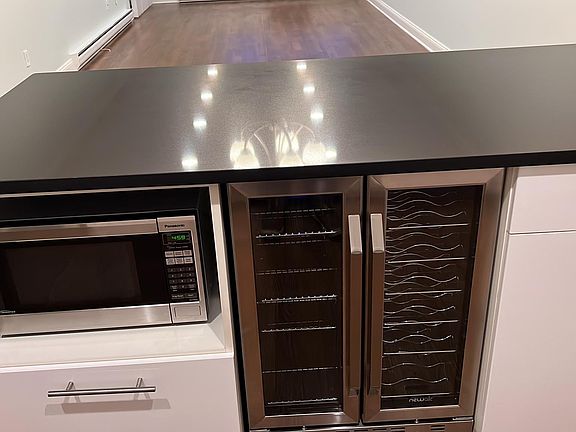 Completely renovated, huge 1 BR unit steps to Springdale train station, restaurants, shopping and ice skating rink! Open floor plan. Fully applianced kitchen with quartz counters, stainless appliances, wine cooler and breakfast bar. Both bedroom and living room have sliders to private terrace. Wood floors throughout. Laundry room has room to use as storage and pantry. Newer water heater, a/c's and programmable thermostats. 1 assigned covered parking spot included. 1 small pet will be considered with a one time non-refundable pet rent of $250. Pet must be board approved. Excellent credit and references required. Excellent credit and references required. One-time, non-refundable $250 pet rent.