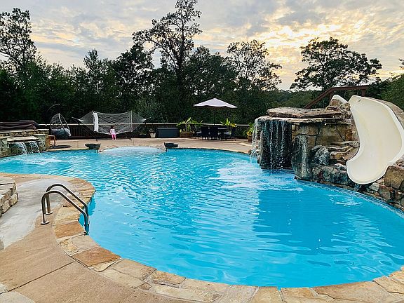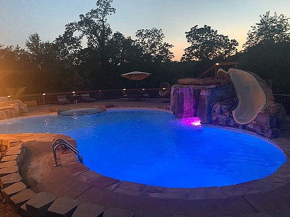 Beautifully updated 5 bedroom 3.5 bathroom with a modern open floor plan and vaulted ceilings. Backyard oasis with resort-style pool, slide, waterfalls, heater and built-in hot tub. New wide plank hardwood floors, new roof (2021), 18 SEER HVAC (new in 2020) with dual heat pump for option of electric or gas heat, upstairs and downstairs thermostats for dual temperature control, new gas fireplace, new lighting, fixtures and finishes throughout. Master suite has huge walk-in closet, large jetted tub and separate tiled shower with rainfall showerhead. 5th bedroom is currently set up as a 12x12 office with tons of built-in storage, upstairs office space, large game room upstairs with pool table, dedicated laundry room. Tray ceiling in dining room, large breakfast nook and bar seating for up to 16 people, ample cabinet space in kitchen, large pantry. Updated bathrooms, three of the bedrooms have walk-in closets. Concrete safe room, oversized garage, video surveillance and security system, surround sound, whole house sound system including outdoor speakers, tons of storage, water softener, gas tank conveys with home. Newly refinished, lighted upper deck and expansive wrap-around lower deck, wood fenced backyard, firepit area and 2 acre manicured yard make for great entertaining. This home sale can close any time after August 2022.