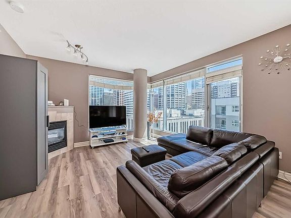 Prime location! Located in FIVE WEST-PHASE 2 building in the heart of Downtown, this bright open floor plan features luxury vinyl plank flooring newly installed in 2020 and a newly replaced electric oven/stove in 2022. This South-facing unit enjoys abundant natural light throughout the day and features air conditioning for summer comfort and a fireplace for cozy winters. Close to all amenities including the Bow River, Pathway System, Restaurants & Shopping. Easy walking distance to the LRT & Downtown Core! Pride of ownership is apparent throughout in this move-in ready suite. This front corner unit, facing South to 5 Ave SW consists of a kitchen w/granite countertops & SS appliances, pen to dining and living room with floor to ceiling windows, corner fireplace & a private balcony with gas BBQ outlet. Large master bedroom with 4-piece ensuite & walk-in closet, second bedroom with cheater door to second 3 piece bathroom, custom built -in computer nook & spacious ensuite laundry. Included is heated underground parking, storage unit, party room w/private sun deck, concierge service, car wash and indoor visitor parking. Located in close proximity to the acclaimed Canadian Western High School, renowned for its excellence in Calgary. Call today for your private viewing!