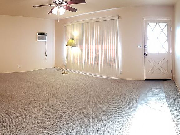 This home has a new roof, rain gutters and dual pane windows throughout. Cooling system is a Tradewinds evaporated cooler along with an A/C wall unit in the living room. Heating system is a cozy dual-sided wall furnace. Kitchen has a new stainless steel stove-hood. Bedrooms, hallway and kitchen have been freshly painted, along with a completely renovated bathroom with new flooring, vanity, fixtures, lighted medicine cabinet, bathtub/tile shower, and glass shower doors. Enjoy the large fenced backyard which includes a newly rebuilt covered patio with new roof and paint. This home is move-in ready!