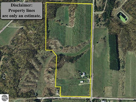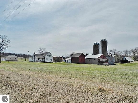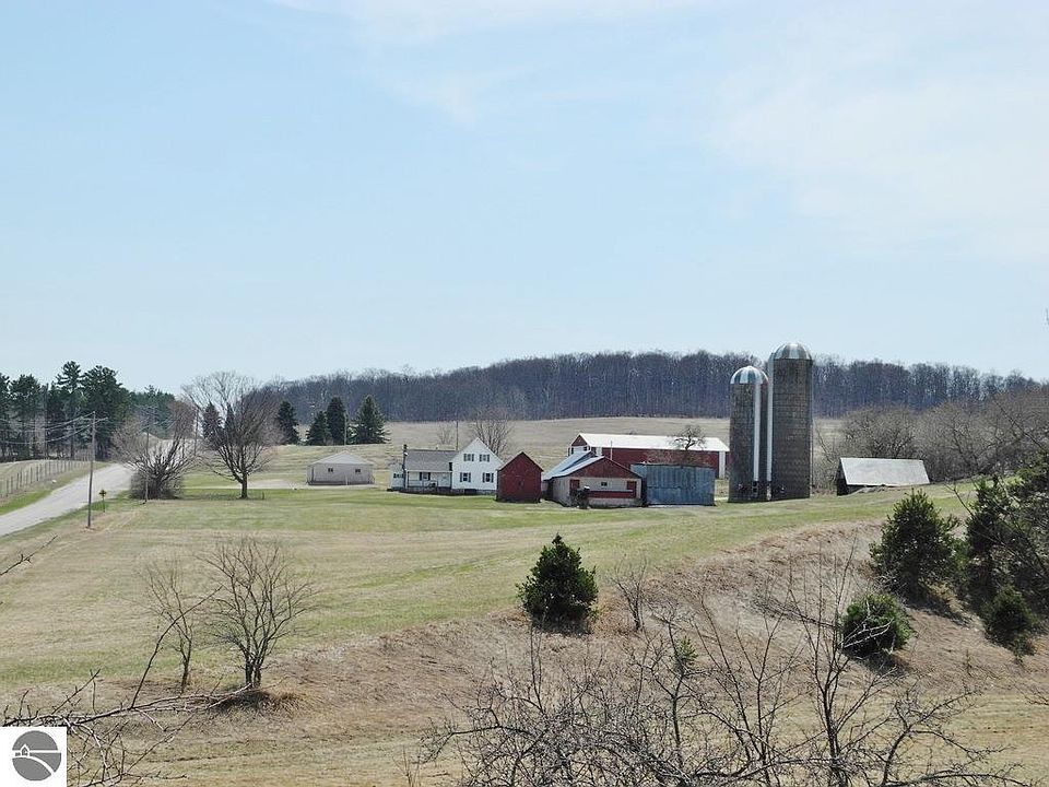 Leelanau County classic farmhouse on 70 acres in beautiful Leland Township! This desirable and rarely available large acreage parcel offers a variety of level, rolling, and open countryside terrain including a large portion of established actively farmed cherry trees. The 1880's era home features 1848 sq ft of finished living area, a large living room, 4 bedrooms, vinyl siding, newer roof shingles, and updated electrical service. Multiple outbuildings include a (60'x 28') 5 car size cement block garage with a cement floor, a (42'x 75') pole barn, 1224 sq ft barn, 1680 sq ft barn, and a 640 sq ft storage building. Central Leelanau County location within 2 miles to Lake Leelanau and only 6 miles to Leland, and Suttons Bay!