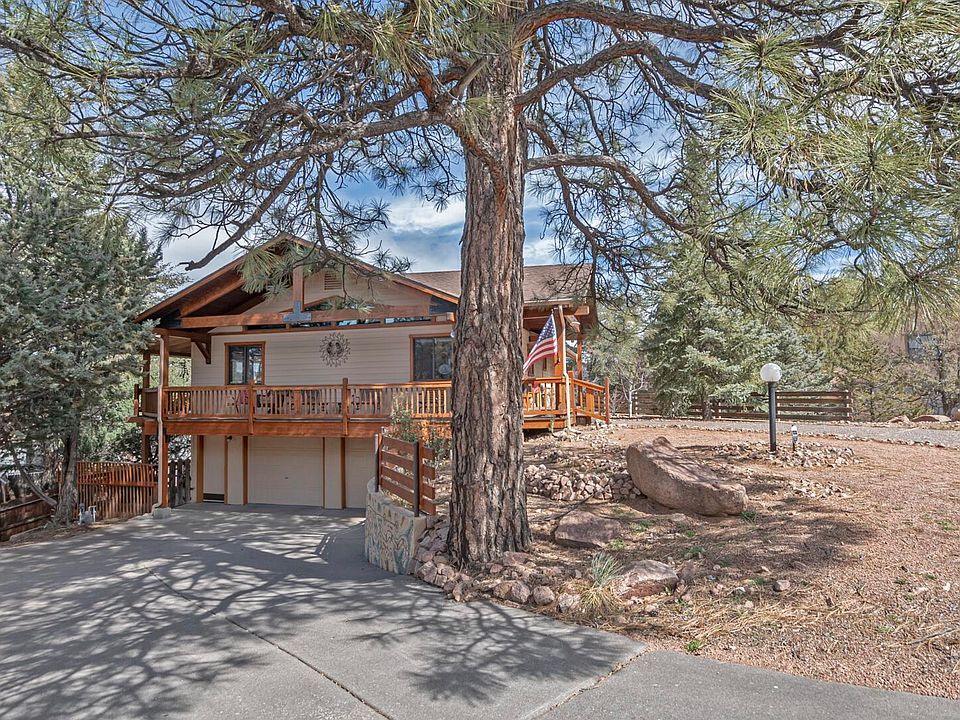 Awesome mountain home with solid wood floors and beautiful cabinetry. This spacious 2-bedroom home has two beautiful, tiled bathrooms on the main floor plus a huge lower level that is currently a family/rec room and bath. Propane gas fireplace downstairs and room heater upstairs. Roof replaced about 4 years ago with screened gutters and exterior repainted summer 2022. Enjoy the mountain views from the covered wrap-around deck. Fenced backyard and attached two car garage. Nice cul-de-sac location. Buyer to verify square footage.