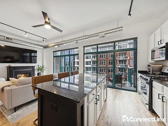 Welcome home to this stunning 1-bedroom, 1-bathroom condo, offering contemporary elegance and incredible city views. With floor-to-ceiling windows that open to a spacious, full-length balcony. The condo features beautiful hardwood floors throughout the common areas, cozy carpeting in the bedroom, and an open-concept kitchen and living area that is flooded with natural light from its southern exposure. The kitchen is fully equipped with stainless steel appliances, a breakfast bar island, and a seamless flow into the living/dining area. The space is anchored by a cozy fireplace, perfect for relaxing or entertaining. This unit comes with secured garage parking on the second floor (space P-92), conveniently located just steps from the elevator vestibule, available for 25,000. Additional storage is located in the basement for your convenience. Recent improvements to the unit include (2022) AC and furnace, (2022) painted kitchen cabinets, (2022) new bathroom vanity, (2024) bedroom door, (202