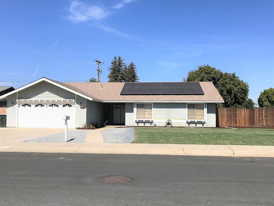 Three-bedroom two bath home with potential RV parking and owned solar. Covered back patio with ceiling fans. Front and back yard landscaping. Laminate flooring throughout, updated kitchen and large walk-in pantry. Generously sized master bedroom with two walk-in closets.