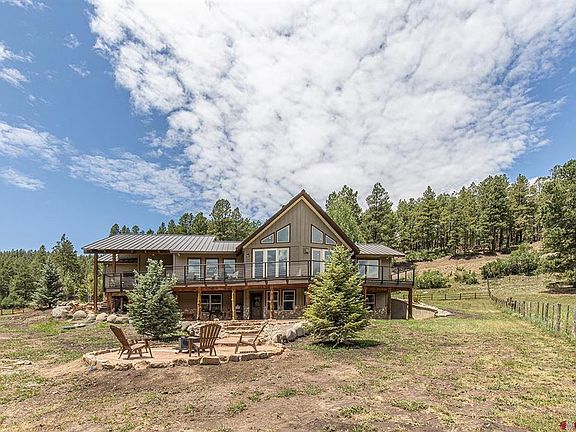 This stunning San Juan River front ranch on 38 acres. This amazing home offers 3235 square feet, attached 3 car garage, barn and a large pond, San Juan river frontage, and ample pasture land. As you enter the home you will be greeted with high ceilings, wood and rock accents and tile floors. The living room features a wall of windows with amazing views, rock accented gas fireplace, vaulted ceilings, log accents, and access to a large deck with newly replaced Trex deck and railing, overlooking the mountains and river valley below. The kitchen is equipped with stainless steel appliances, large island, 6 burner gas stove and alder wood cabinets. The dining area is open to the kitchen and living room and has an additional access to the large deck. The main level also includes a primary bedroom with ensuite bathroom and a large easy access tile shower. Additionally the main floor has a office/laundry room complete with alder wood cabinets and laundry sink, a powder room, and a large pantry and mud room off the kitchen with access to the garage. Head down the hardwood steps with wrought Iron railings and you will be greeted by a second living area with lots of windows, wood fireplace and mini bar complete with sink, mini fridge and wine fridge. The lower level also features a second primary bedroom with ensuite bathroom, a guest bedroom, flex room/non-conforming bedroom, and another bathroom. This level has a private entrance off the back covered patio and is a perfect guest quarters. You will enjoy the outside with San Juan river frontage, fire pit, mature trees, flagstone paths with river rock accents and plenty of room to roam. The large 3 car garage has plenty of room. The spacious barn has an overhead door to easily access your tractors and outdoor toys. The property has several pastures that are fenced. Enjoy the unmatched privacy, Colorado landscape, private river access, all just a short drive north of Pagosa Springs. Don’t miss out on this rare river front property!