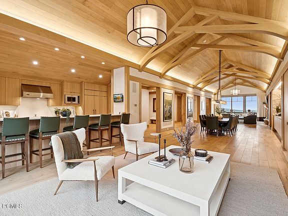 Bathed in natural light, the open-concept layout showcases soaring ceilings, expansive windows, and light wood throughout, creating a modern yet timeless alpine elegance. Every space has been carefully crafted to highlight breathtaking panoramas—from sweeping mountain ridgelines to the expansive valley below.