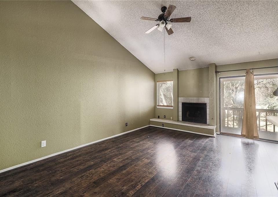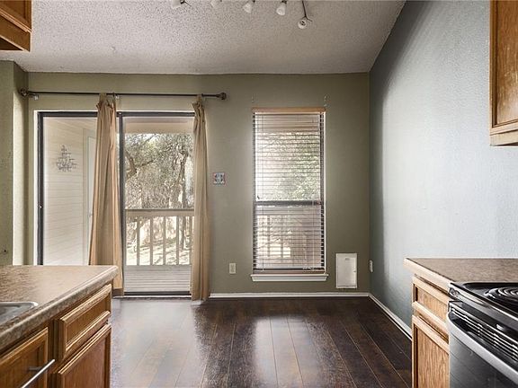 top floor end unit with covered patio overlooking green space and trees. High Vaulted ceiling, wood laminate flooring and a gas fireplace. In-Unit stacked washer/dryer conveys as does Fridge. Wonderful Northwest Hills location convenient to Arboredum, The Domain and easy access to 360/ Loop 1/ 183 HOA covers all but electric and cable and gas (for fireplace only)
